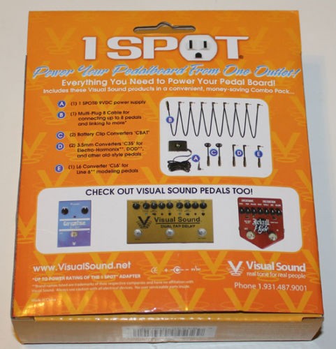 The New  Visual Sound 1 SPOT Combo Pack consists of a 1 SPOT 9V DC Power Adapter, Multi-Plug 8 Cable, (2) Battery Clip Converters, (2) 3.5mm (1/8”) Converters and an L6 Converter for Line 6 modeling pedals.