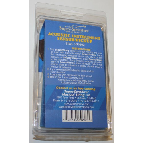 SENSOR/PICKUP The Super-Sensitive Sensor/Pickup amplifies sound for all types of acoustical instruments. It utilizes a piezo transducer that delivers full sound to amplifiers for faithful reproduction. Easily affixes and removes from instruments with a non-marring, reusable adhesive. Kit Includes: acoustic Sensor/Pickup Thin, 10 foot cable with 1/4 inch amplifier plug Non-marring, reusable adhesive available in: 9200 Plain.