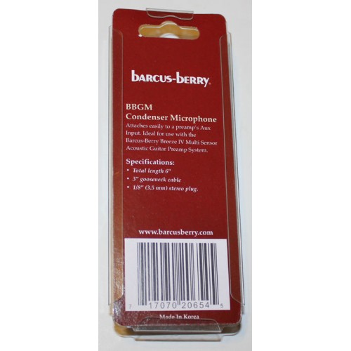 Compliment the BreezeIV preamp system with the condenser microphone and open your sound up to increased tonal flexibility. Attaches easily to a preamp's Aux Input. Ideal for use with the Barcus-Berry Breeze IV Multi Sensor Acoustic Guitar Preamp System. Specifications: Total length 6, 3 gooseneck cable, 1/8 (3.5mm) stereo plug.