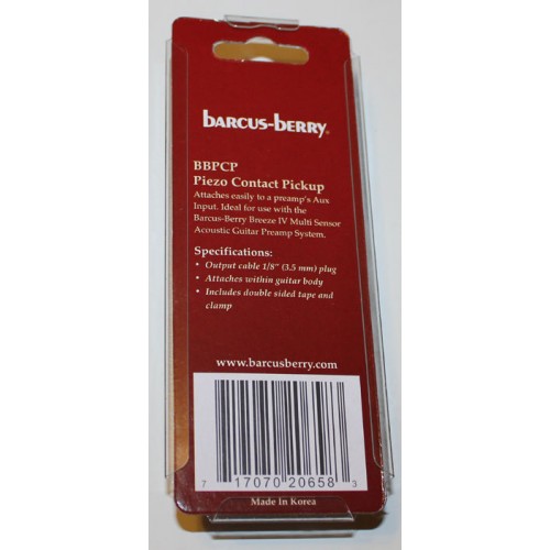 Compliment the BreezeIV preamp system with the piezo contact pickup and open your sound up to increased tonal flexibility. Attaches easily to a preamp's Aux Input. Ideal for use with the Barcus-Berry Breeze IV Multi Sensor Acoustic Guitar Preamp System. Specifications: Output cable 1/8 (3.5mm) plug, Attaches within guitar body, Includes double sided tape and clamp.