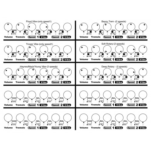 The two footswitch buttons provide bypass and speed control, allowing the user to switch between two different Speed and Vibe settings while sharing a common Tremolo control. If a Vibe knob is turned down, then the sound will be only tremolo, and can be tweaked from smooth to 'Jerky'....but as the Vibe is added, the resulting combination can provide a subtle vocal quality or a dramatic pitch shift.