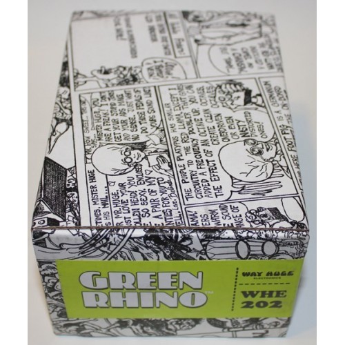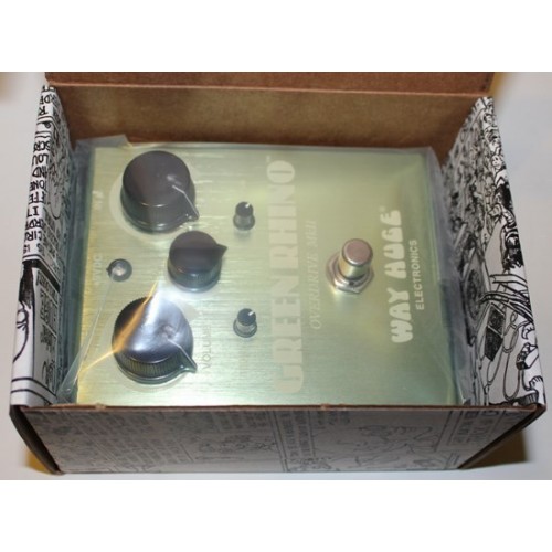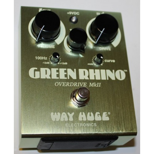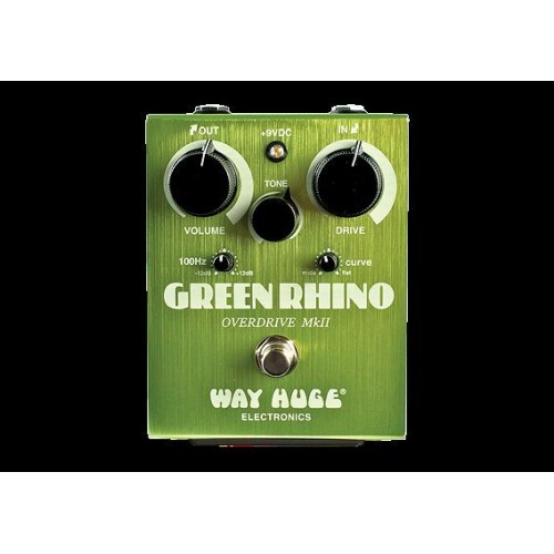 The legendary Way Huge Green Rhino has returned! The Mk II has all the gorgeous classic overdrive that you crave but it has evolved to include cool new features that make it even more rhinoceriffic. In addition to the Volume, Tone, and Drive controls, you get a 100Hz EQ knob to cut or boost your low end by 12dB. Your low notes can either shake the ground like a stampede across the savannah or cut through the mix like a charging rhino’s horn. This pachyderm of a pedal also sports a Curve control to fine-tune the corner frequencies of your tone. All this amazing tone shaping makes other overdrives seem boring and one-dimensional by comparison. In front of a clean amp, with the Volume and Drive set at noon, you can go from pristine purity to a punchy, dynamic rhythm tone. Set the Drive low and crank the Volume and add tons of boost to wallop the input of any amp. Turn up the Drive control with the Rhino in front of a distorted channel and hear more gain and sustain than you ever thought your amp was capable of. And no matter how you use it, the Green Rhino Mk II will deliver clean operation, quiet relay-based true-bypass switching, and the rock-solid construction that Way Huge is famous for.