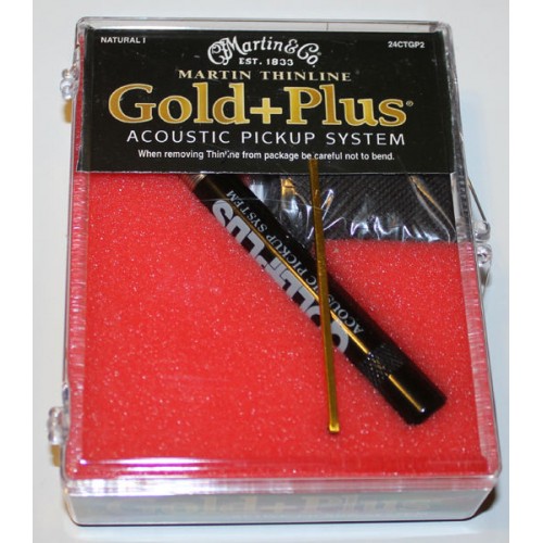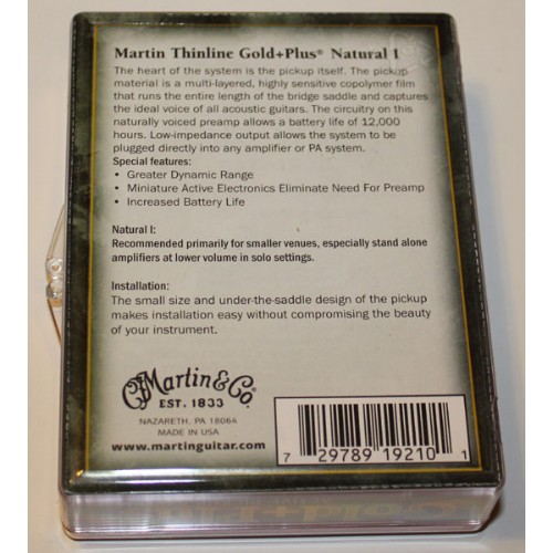 The Martin Gold+Plus Pickup is voiced to control boominess and to provide extra brightness. Recommended for musicians in situations where the guitar needs to stand out and sound natural without feedback. The Martin Thinline Gold+Plus Pickup's preamp circuitry gives a battery life of up to 12,000 hours.