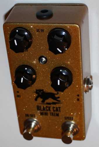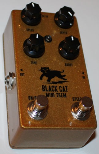 The Black Cat Mini Trem is a dual function tremolo/clean boost in one pedal. Part of the legacy of the original Black Cat line, the new Mini Trem sports some additional features and a spiffy new look. At the heart of this pedal is a classic, sixties-style tremolo with Speed and Depth controls. The circuit also incorporates a clean FET boost with controls for Boost and Tone. Finally, we’ve added a second stomp switch that allows for half-speed/double-speed switching, and an LED that flashes in time with the rate of the tremolo.