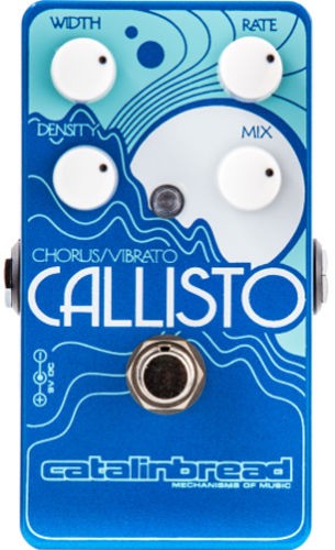 The Catalinbread Callisto is a Chorus/Vibrato pedal, which employs an MN3007 Bucket Brigade chip at its core. It's interface is simple, intuitive, and provides a multitude of sounds ranging from subtle and shimmer to rotary speaker-like to off-kilter warping/warble sounds.