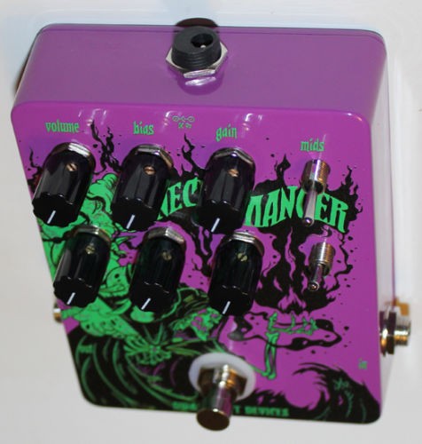 The Necromancer started as the Super Fuzz style circuit from the Silver Rose v2. We added a middle band was added to the EQ. The Mids knob is tuned to the deepest frequency dip created by flipping the “Mids” toggle down, allowing players to get a little more picky with their scooped tones.