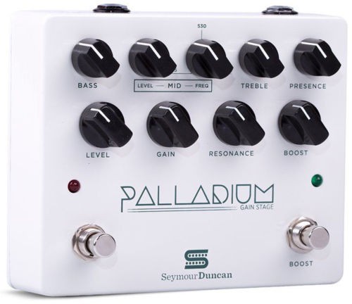Palladium features three gain stages: a gain stage to control the overall saturation, a resonance control for low frequency gain shaping and a boost control that adds overdrive to the beginning of the signal path. These three gain stages allow for a versatile range of tones, from classic rock at lower settings to modern metal at higher gain settings. The pedal also offers a comprehensive EQ, with bass, treble, presence and sweepable midrange-frequency control, so you can make Palladium sound perfect with any amp.