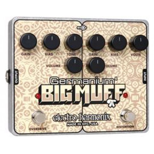 Combining four classic germanium transistors, the Germanium Big Muff Pi is the result of a focused modern design dripping with EH analog heritage. An independent overdrive and distortion each have their own sets of two germanium transistors as well as independent controls. The ability to stack and use both the overdrive and distortion together delivers the power of a four germanium transistor circuit with ultimate control flexibility.