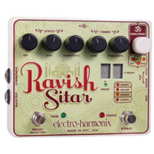 Very few instruments offer as much harmonic and dynamic flexibility as a sitar. Electro-Harmonix has streamlined the essence of the sitar into a compact enclosure that offers a polyphonic lead voice and tunable sympathetic string drones that dynamically react to your playing. Create your own custom scales for the sympathetic strings while you set the decay time for the lead voice. Two expression pedal inputs allow you to bend the pitch of the lead voice and control the volume of the sympathetic strings simultaneously. These unique controls offer the player the ability to program the Ravish to become a totally unique and organic instrument unto itself. The Ravish is a truly new design with the flexibility to be a crossover tonal wonder.